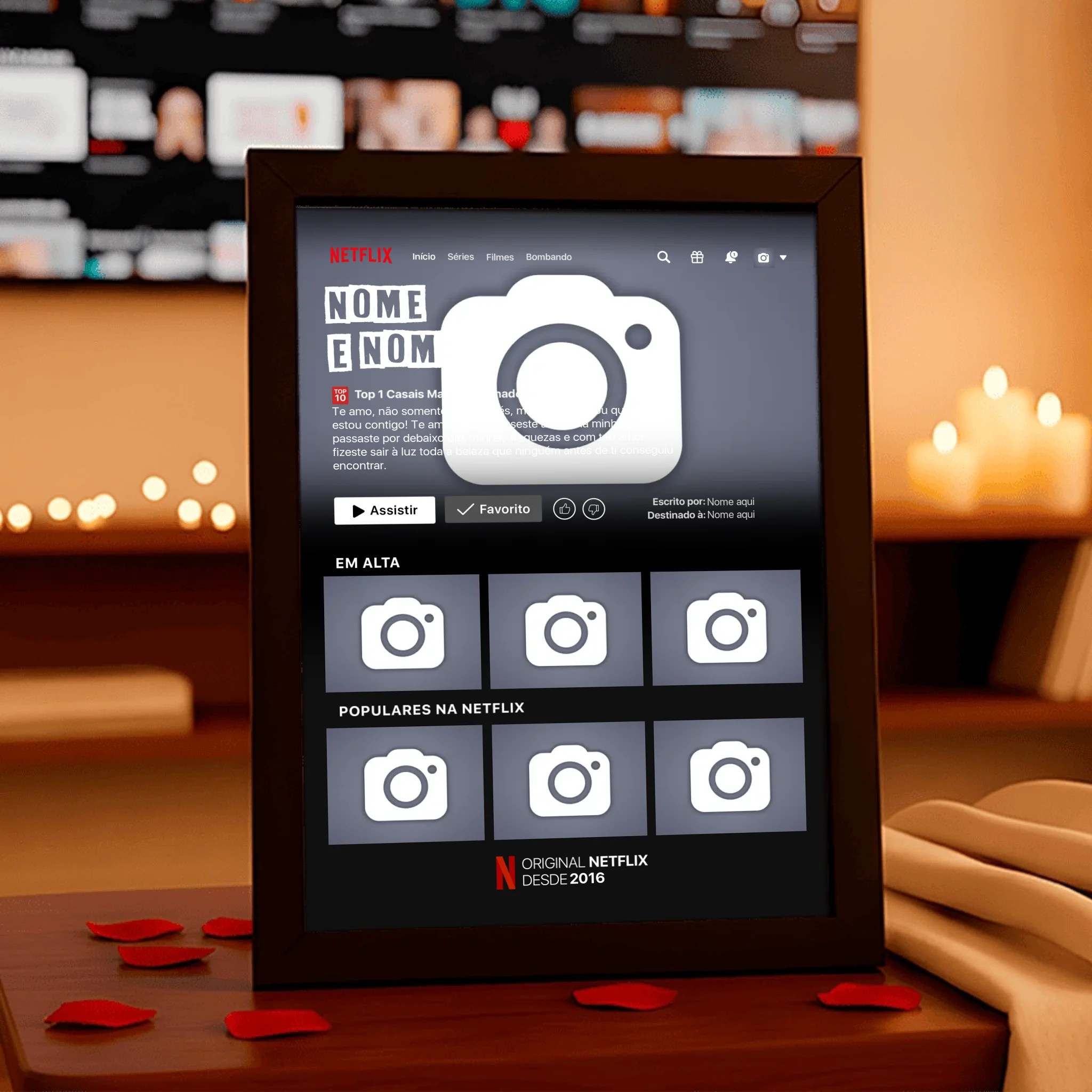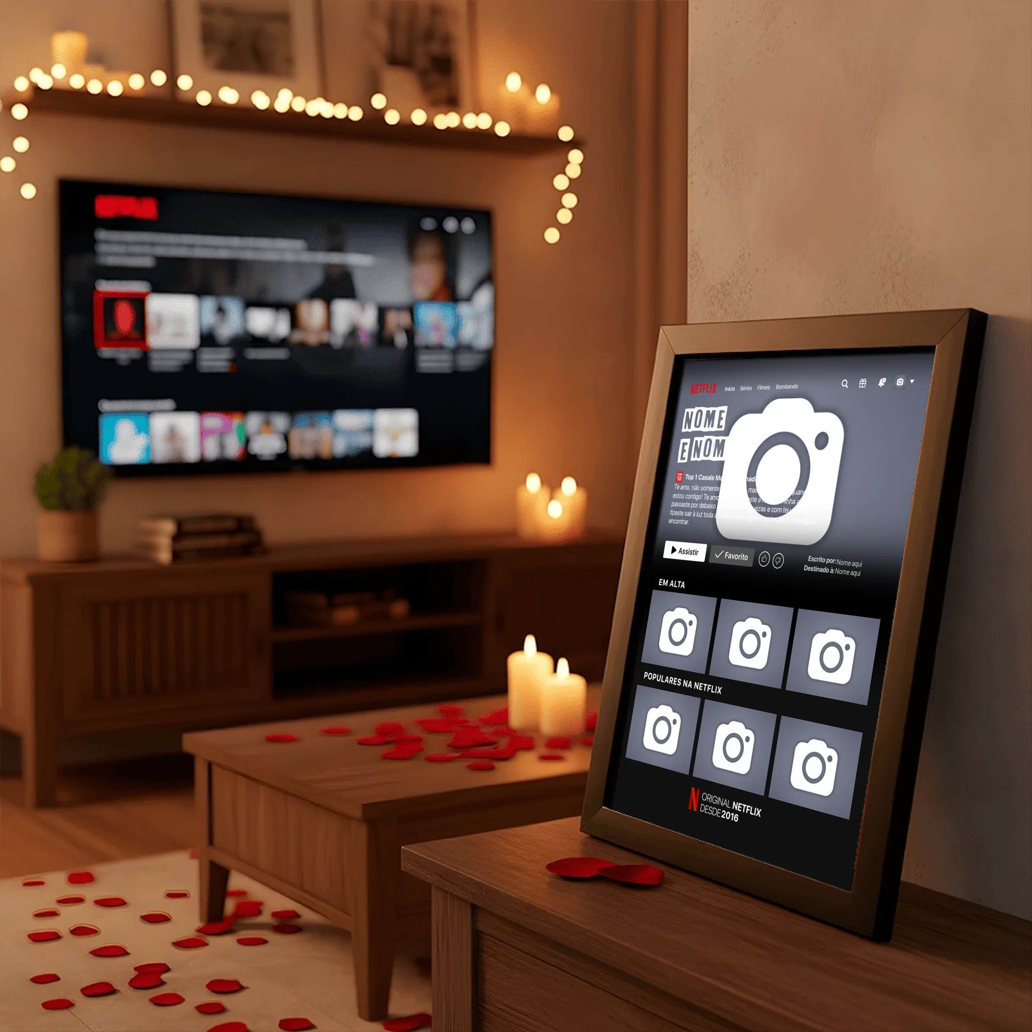 ✨ Transforme seu amor por séries e filmes em uma obra de arte exclusiva com o Quadro Netflix Personalizado! ❤️🎬 Crie um quadro único que conta sua história com fotos, nomes, uma sinopse criativa e detalhes que refletem seu relacionamento ou momentos especiais como se fossem parte de uma produção cinematográfica. 💑🎥
