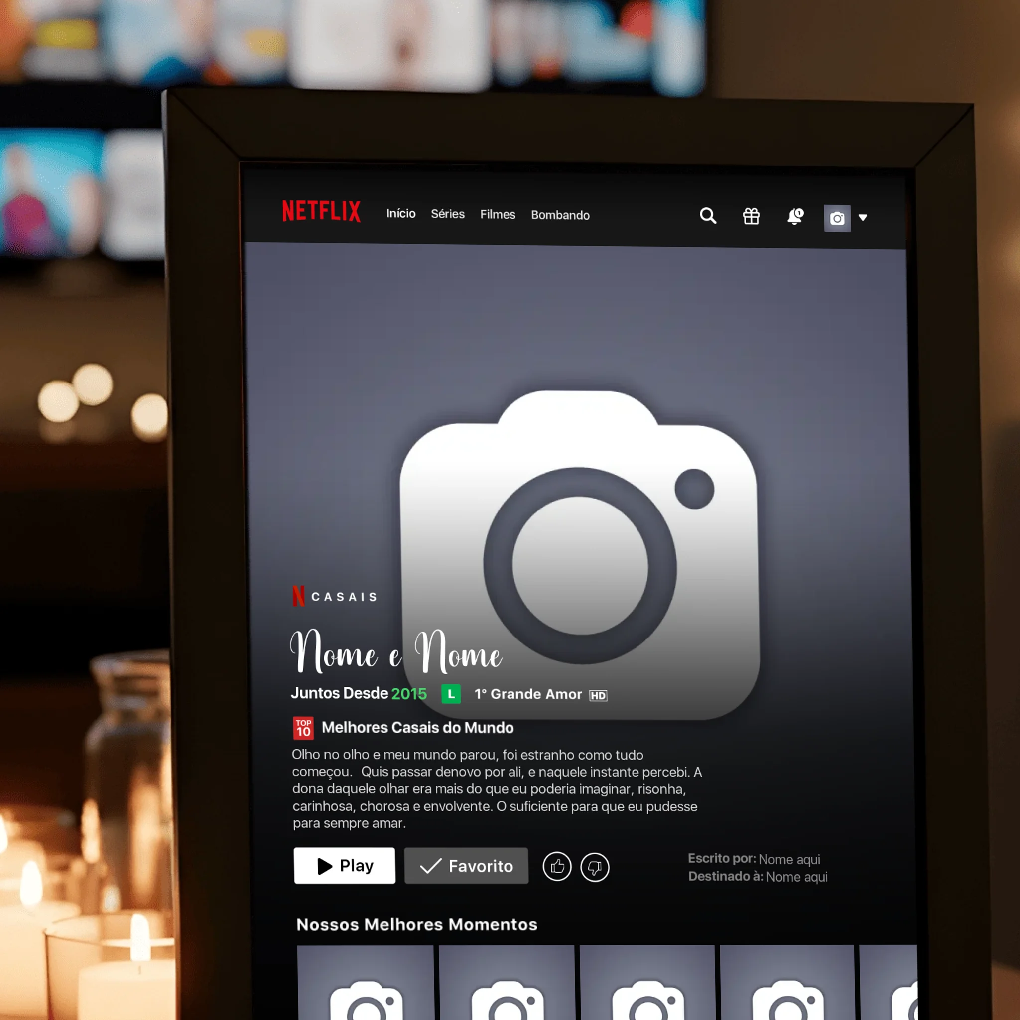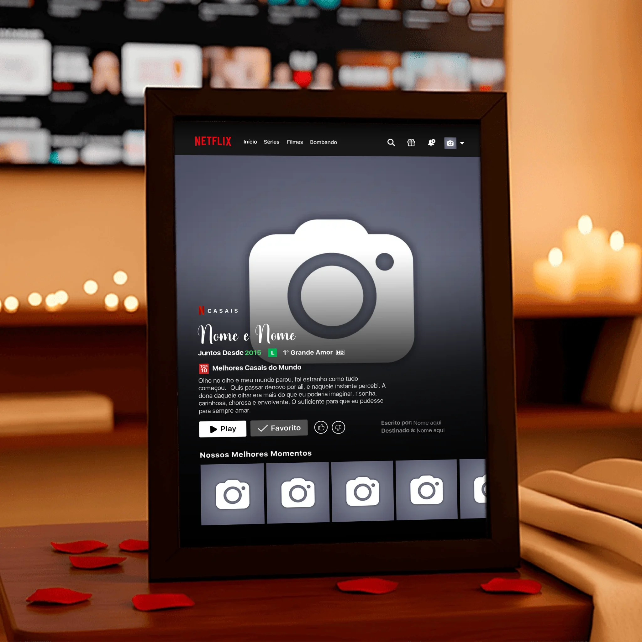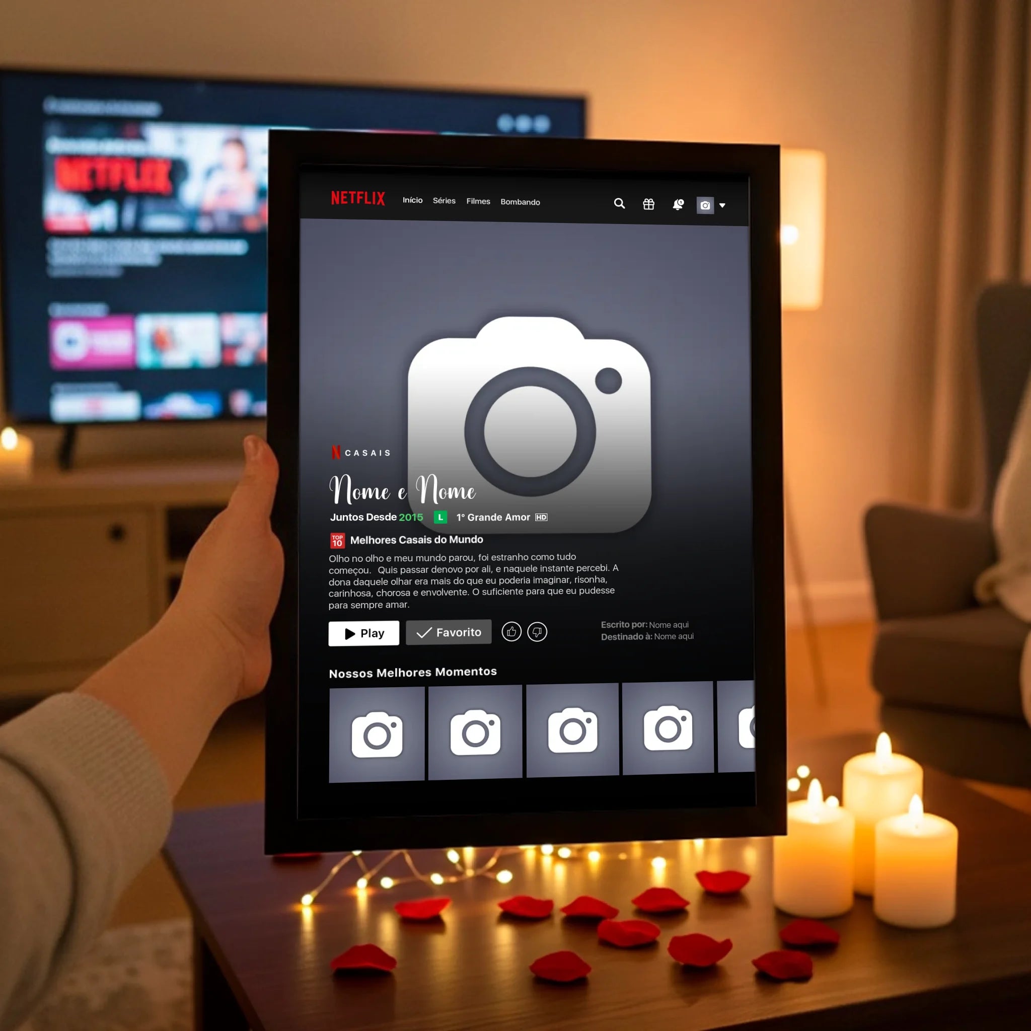 ✨ Transforme seu amor por séries e filmes em uma obra de arte exclusiva com o Quadro Netflix Personalizado! ❤️🎬 Crie um quadro único que conta sua história com fotos, nomes, uma sinopse criativa e detalhes que refletem seu relacionamento ou momentos especiais como se fossem parte de uma produção cinematográfica. 💑🎥